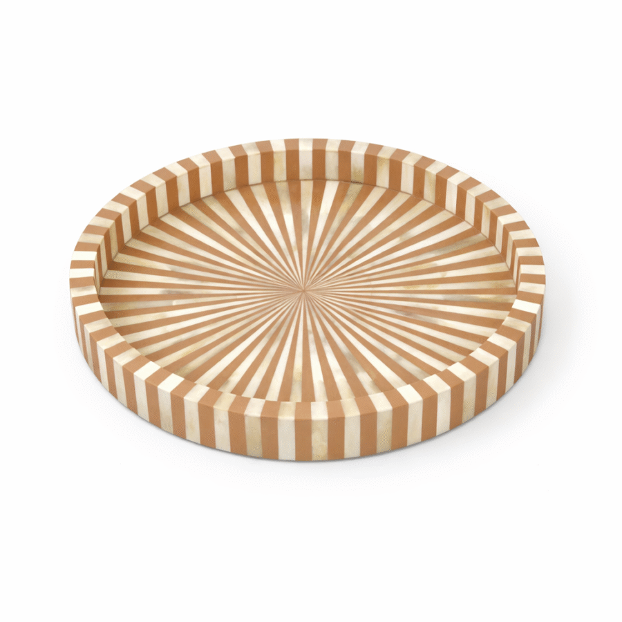 Handmade Round Bone Inlay Tray With a radial stripe pattern in a tan and white finish