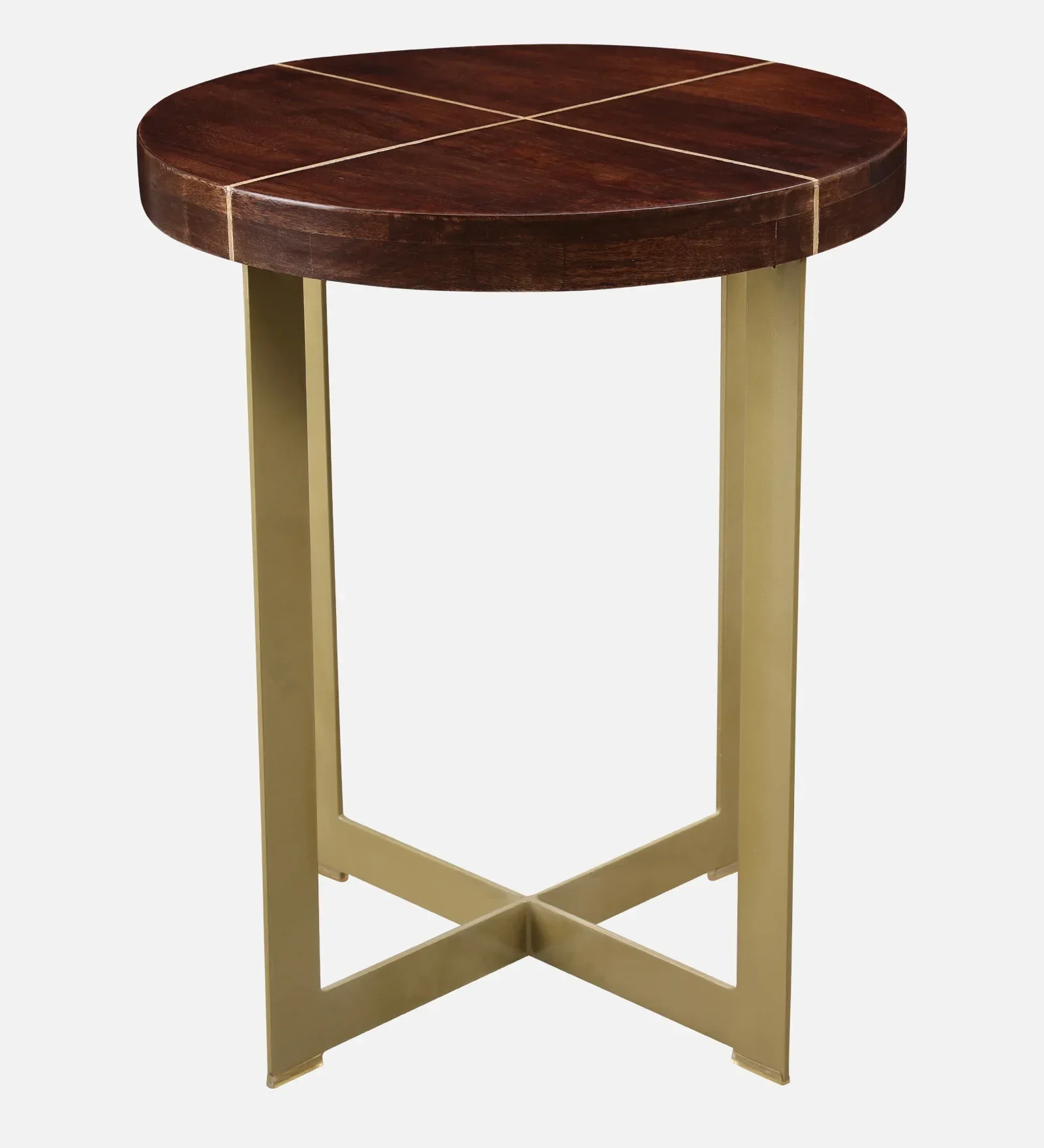 Augustin Solid Wood Side Table in Walnut Finish with Gold Inlay & Metal Base