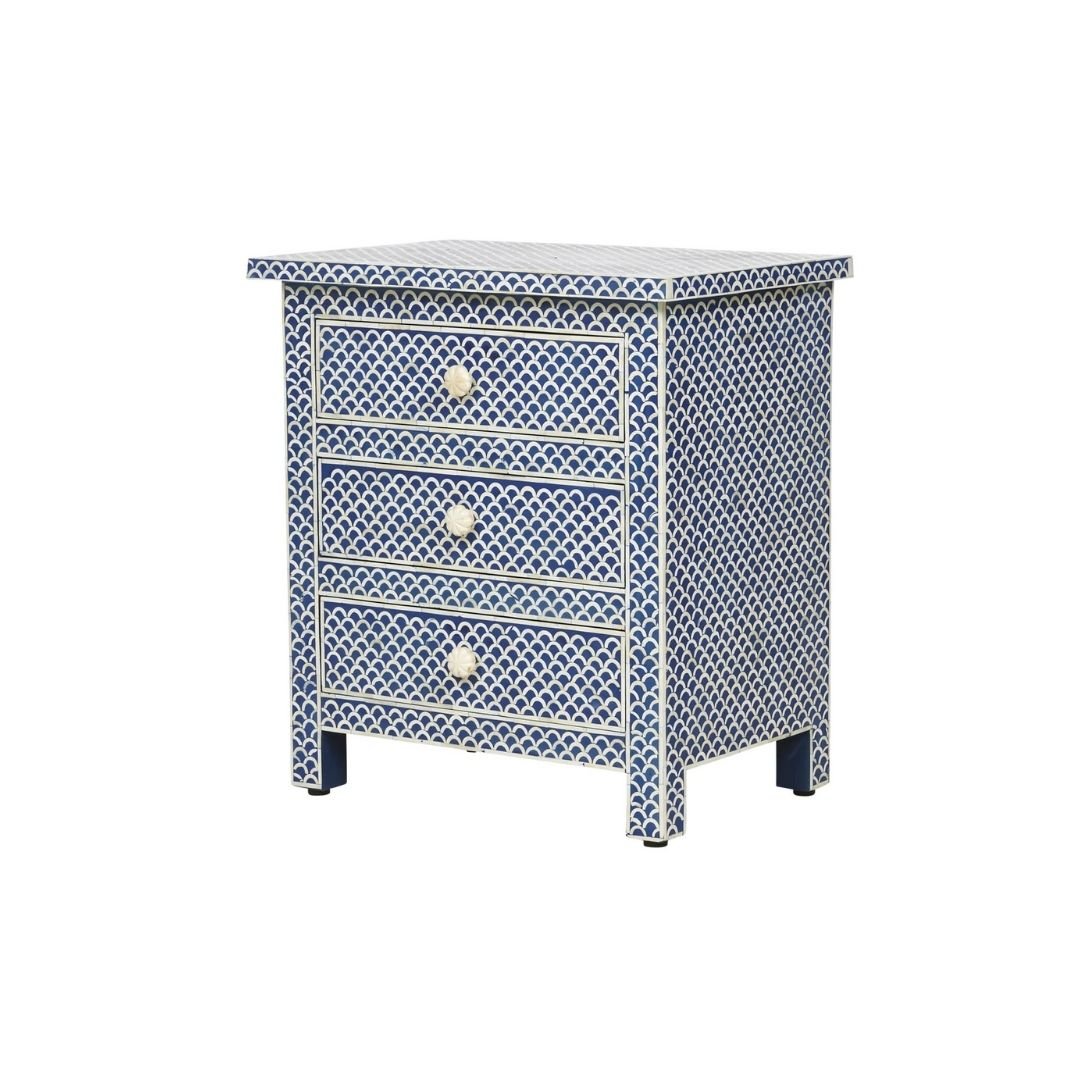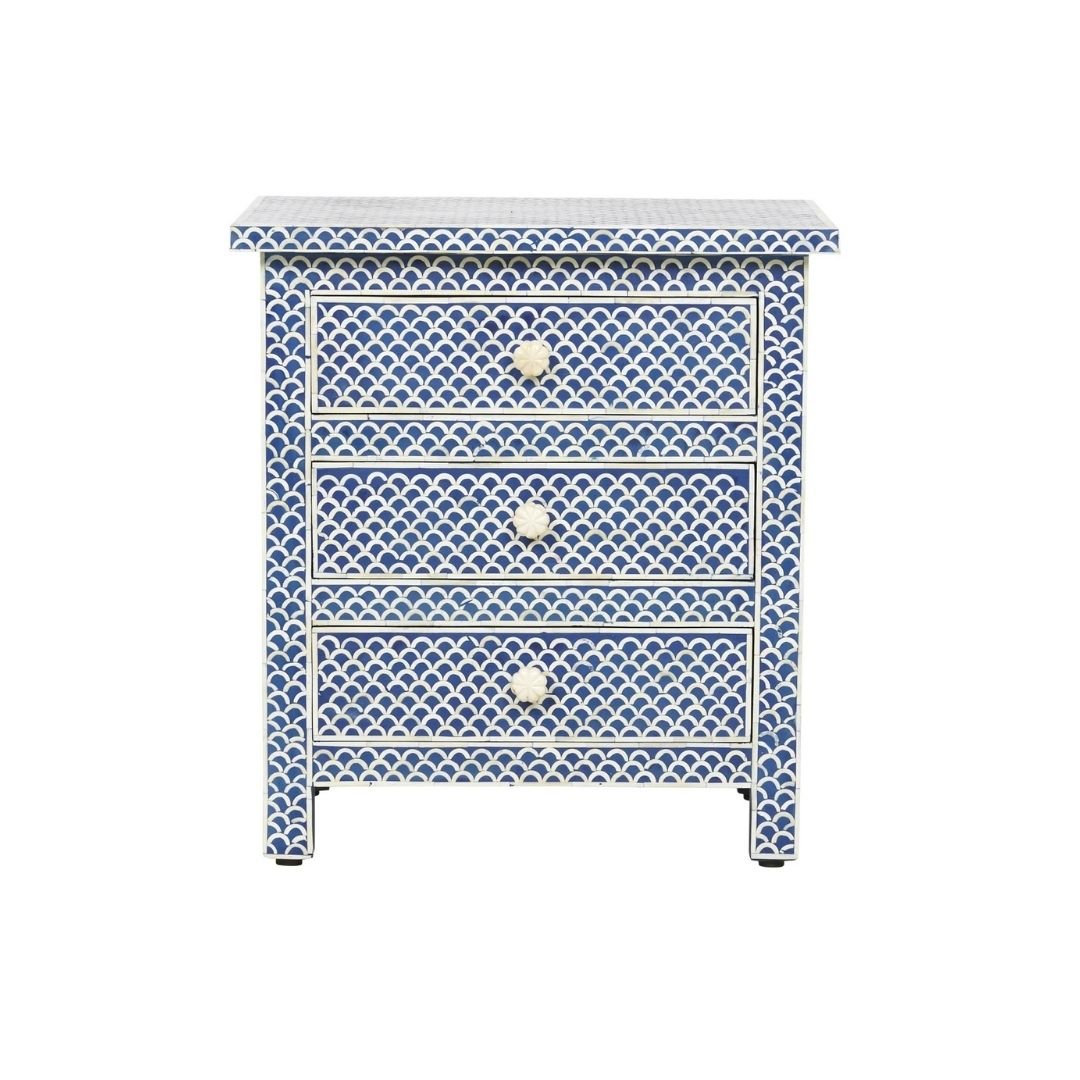 Be the first to review “Bone Inlay Lattice Dark Blue Bedside Table With 3 Drawers” Cancel reply
