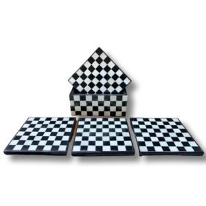 A stunning Monochrome Bone Inlay Nesting Coffee Table Set, featuring bold black-and-white geometric patterns and handcrafted detailing. Stylish, space-saving, and perfect for modern interiors.