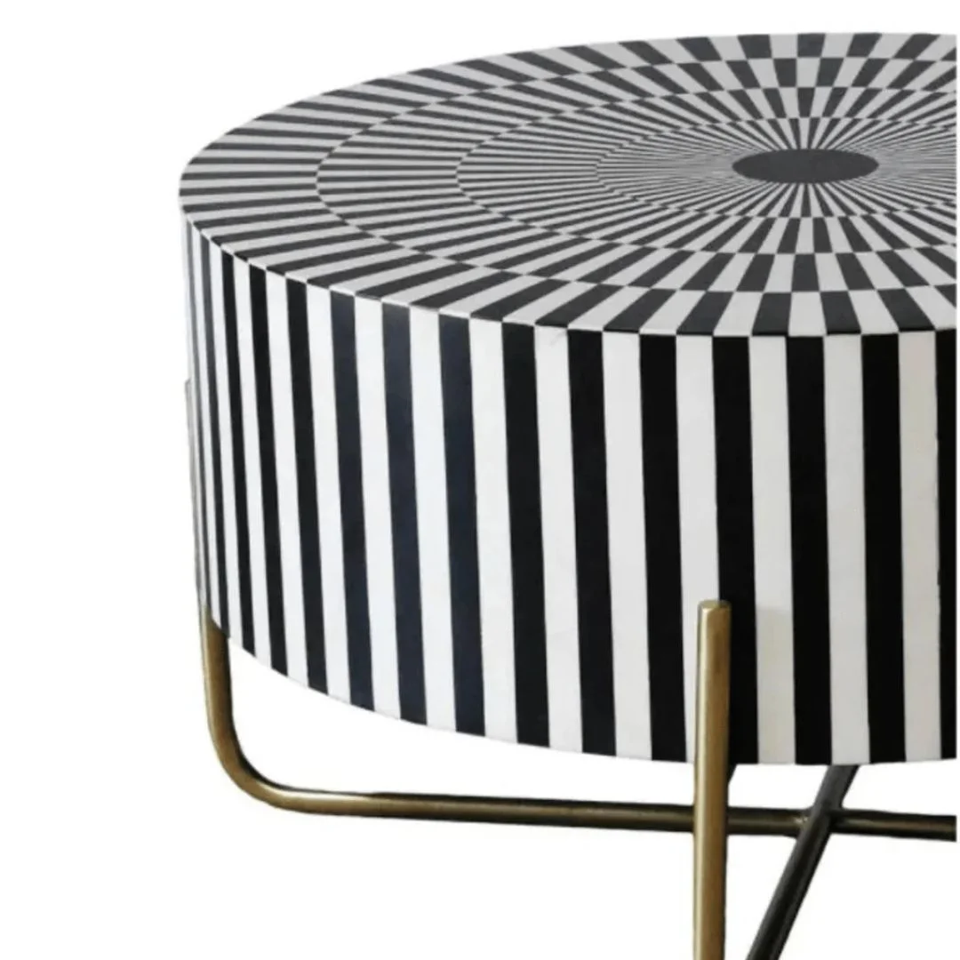 Make a bold style statement with our Bone Inlay Round Black & White Coffee Table, meticulously handcrafted using traditional techniques. Each piece of bone is individually shaped and set into a stunning geometric pattern that radiates from the center, creating a mesmerizing visual effect.