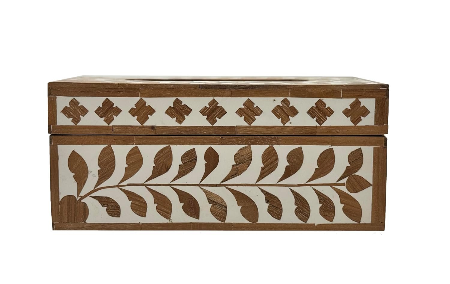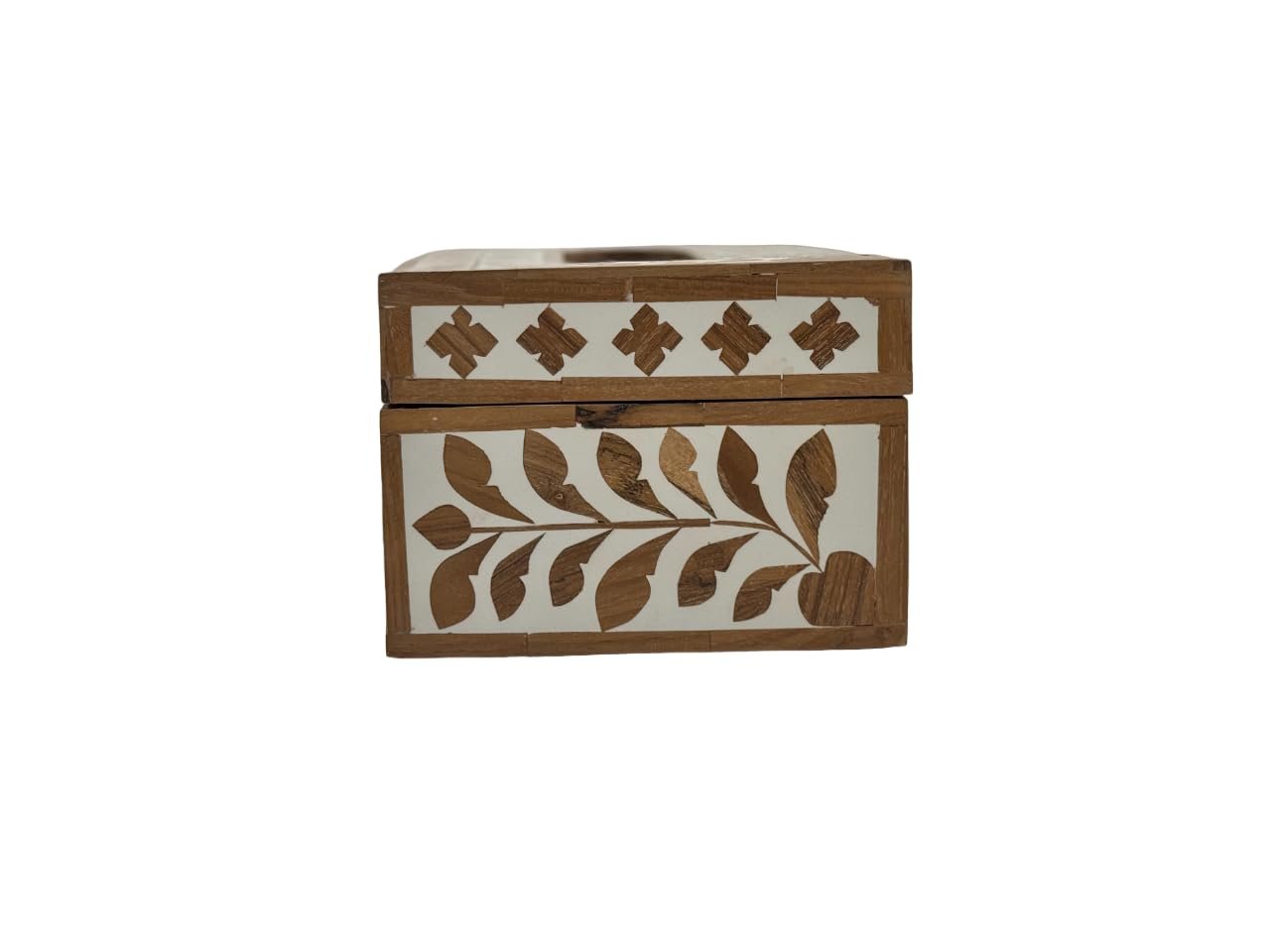 Elevate your everyday essentials with this refined Teak Wood Tissue Box Holder, thoughtfully handcrafted to bring understated luxury into your space. Featuring an elegant leaf design in soft white resin set against natural teak wood, this piece embodies timeless craftsmanship and modern minimalism.