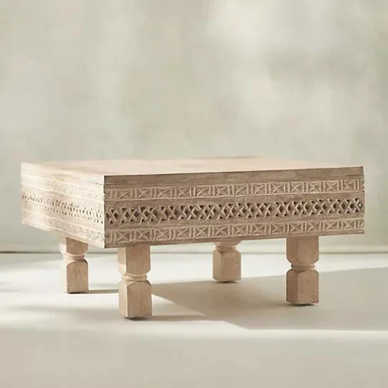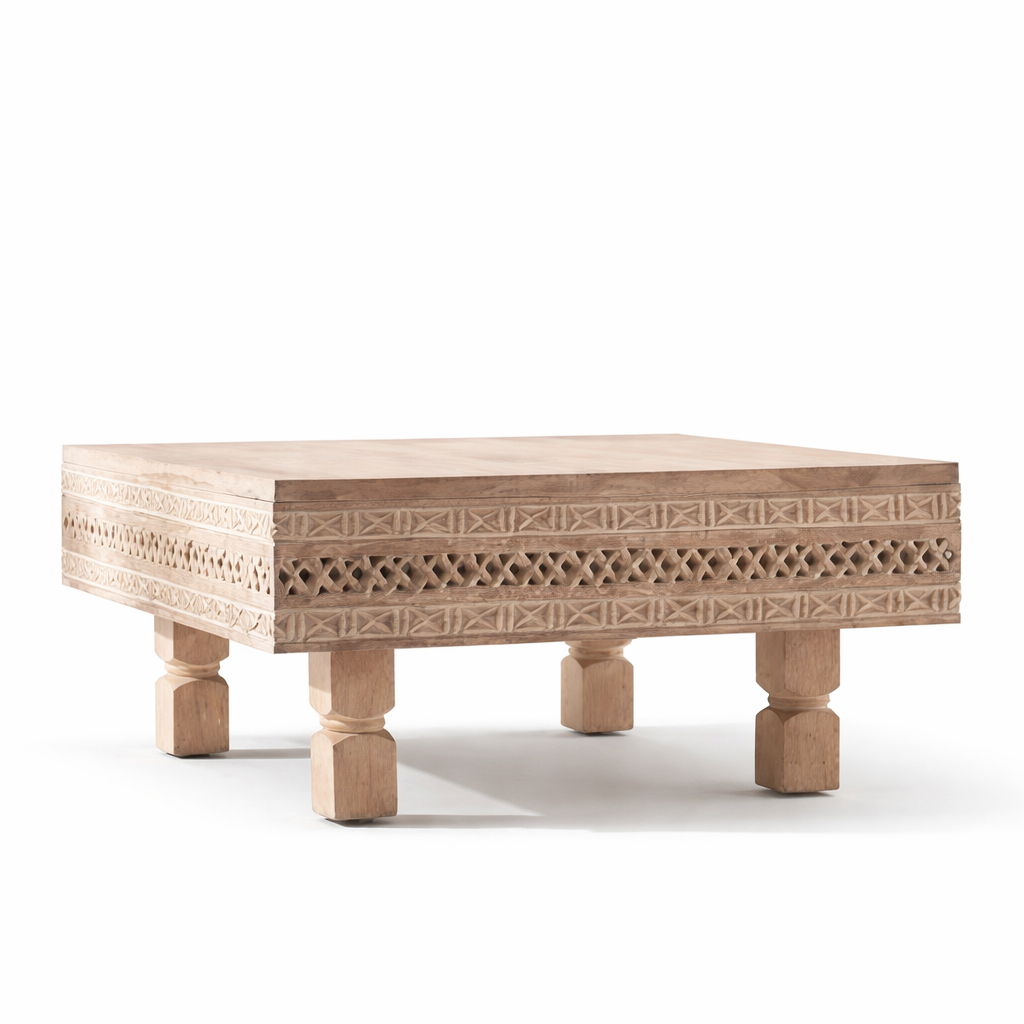 Elevate your living space with this hand-carved mango wood coffee table, a stunning blend of artisan craftsmanship and timeless design. Expertly handcrafted in India, this square coffee table features intricate geometric lattice carvings created by skilled artisans using traditional hand-carving techniques.