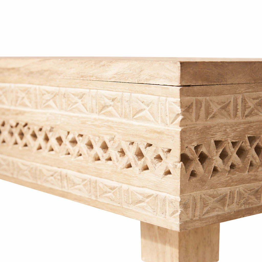The solid mango wood construction ensures durability and strength, while the distressed whitewashed finish reveals warm natural wood undertones, adding depth and character. Decorative carved bands showcase layered triangular motifs and pierced diamond lattice panels, creating a rich textural appeal from every angle.