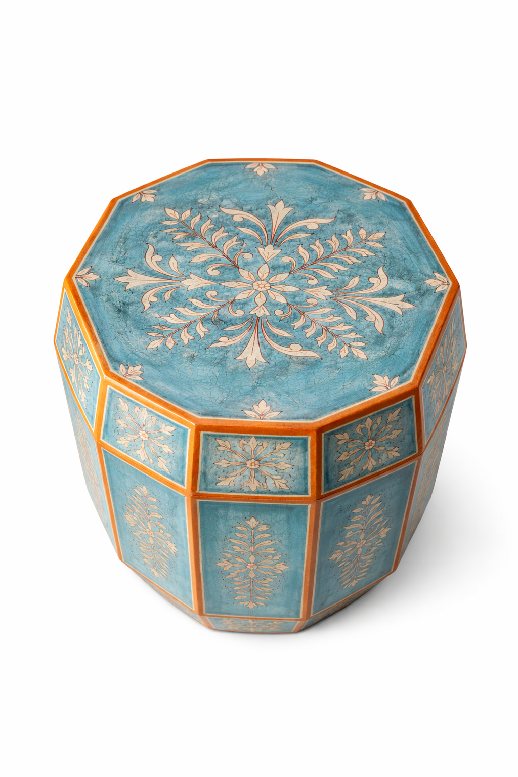The compact cylindrical silhouette makes it perfect for use as a coffee table, side table, or decorative accent, while the smooth hand-finished surface ensures durability and easy maintenance. Each piece is individually hand painted by skilled artisans, making every table truly one of a kind.