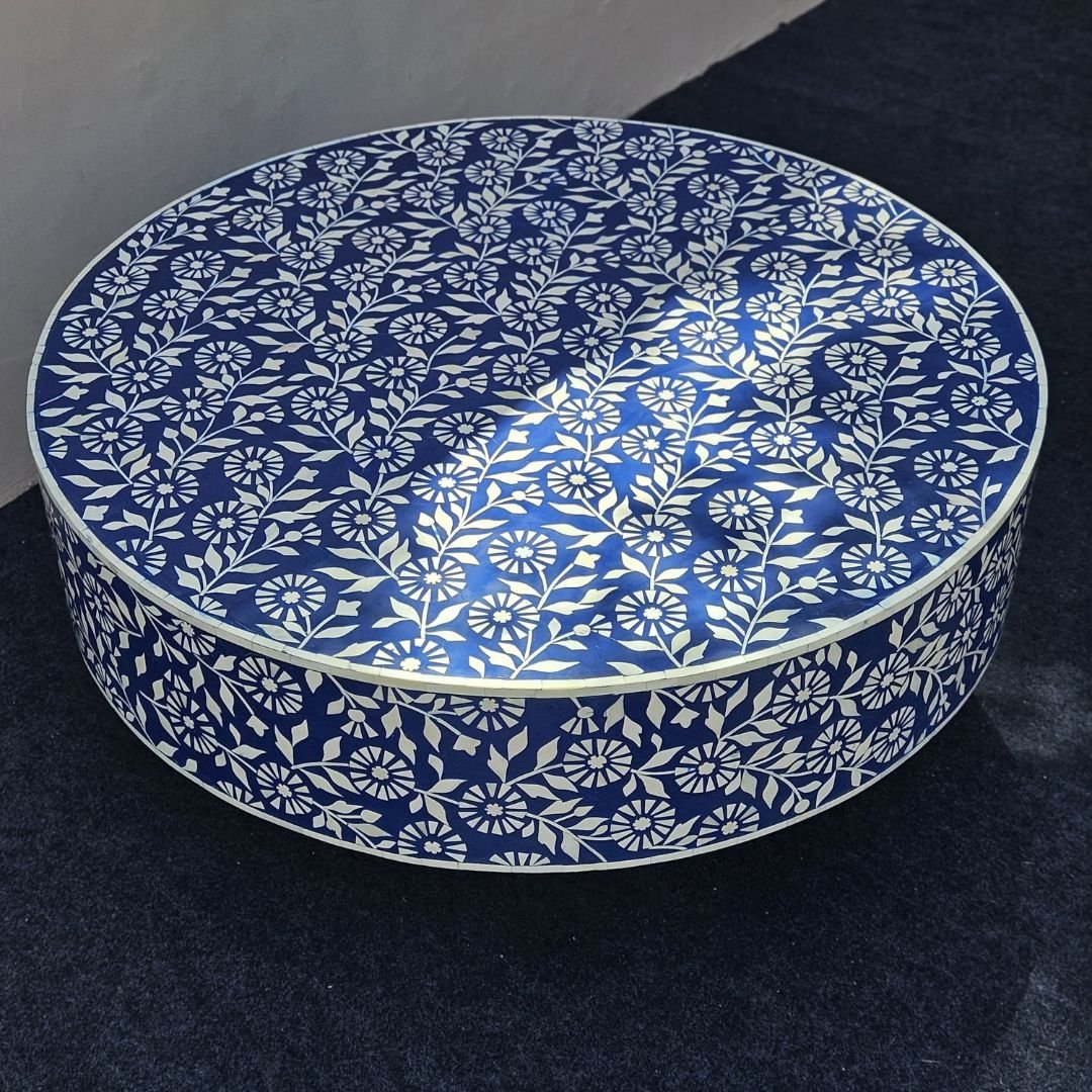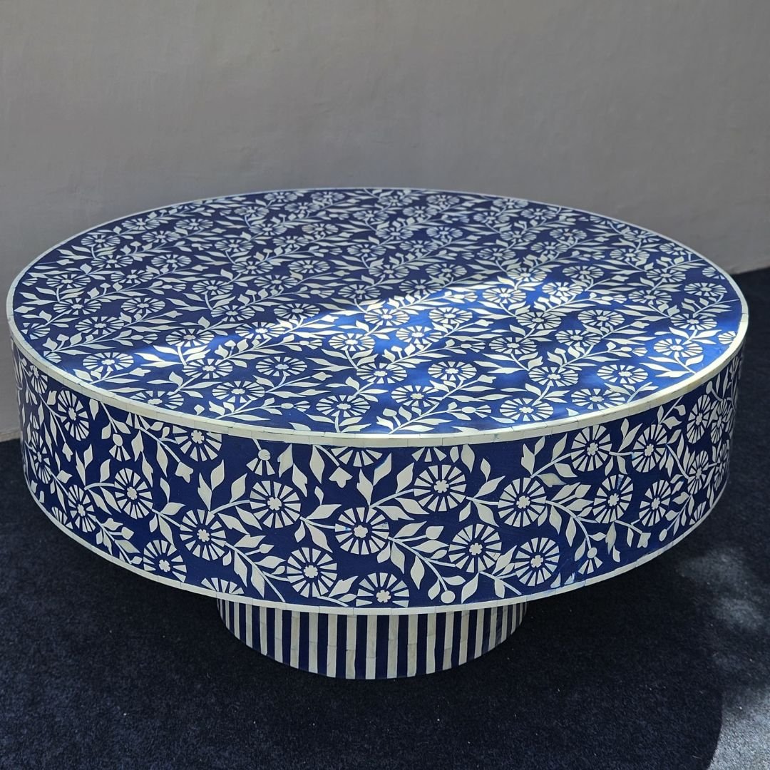 Elevate your living space with this stunning Indigo Floral Bone Inlay Round Coffee Table. Handcrafted by skilled artisans, it features intricate floral bone inlay patterns in rich indigo tones, giving any room a luxurious, modern, and artistic appeal.