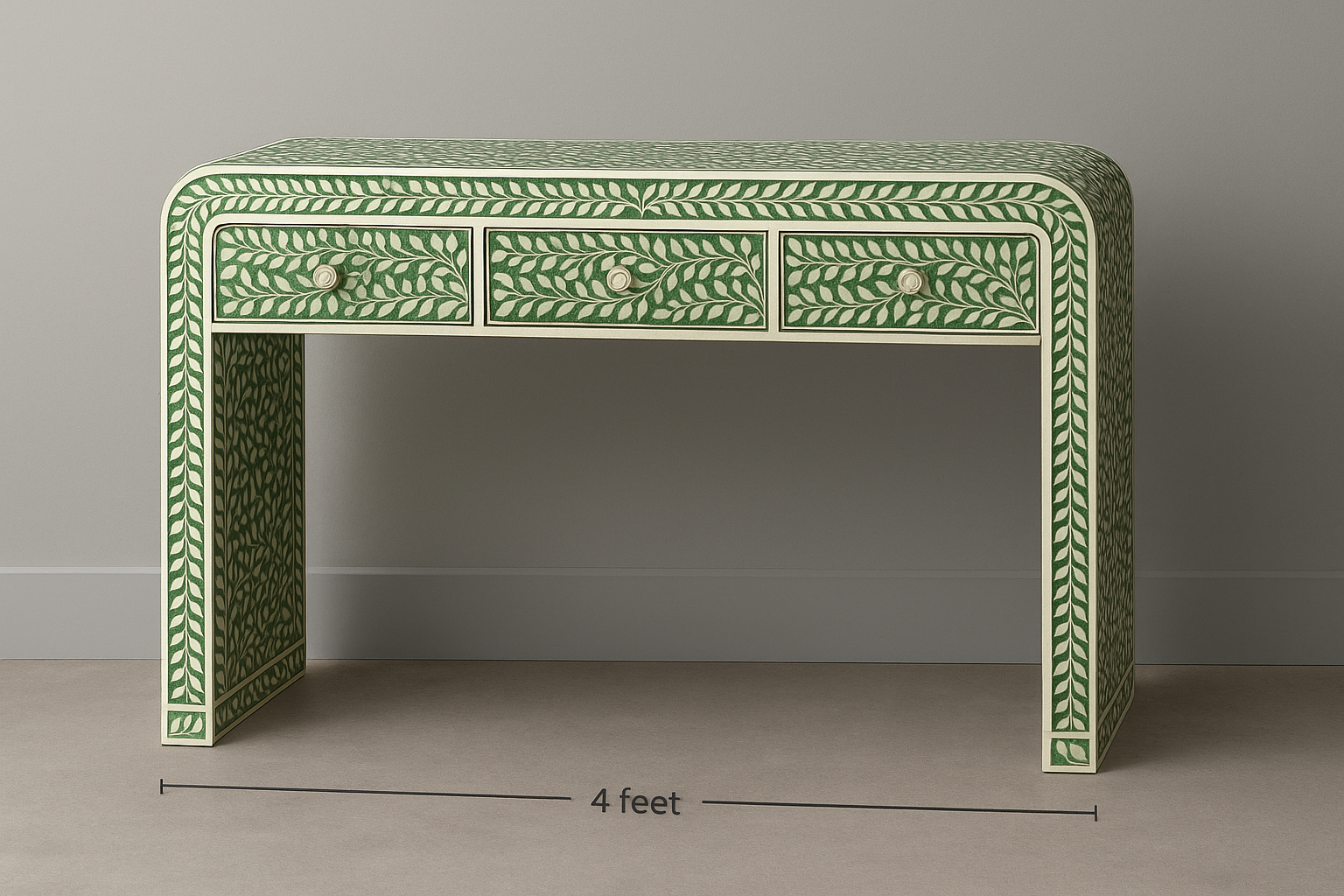 Mother of Pearl Inlay Waterfall Console Table with 3 Drawers – Elegant Green Leaf Pattern, 4 Feet