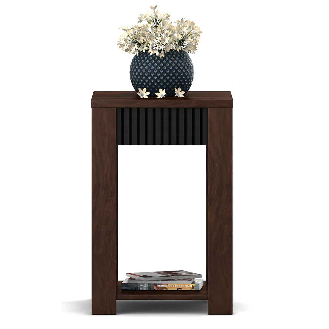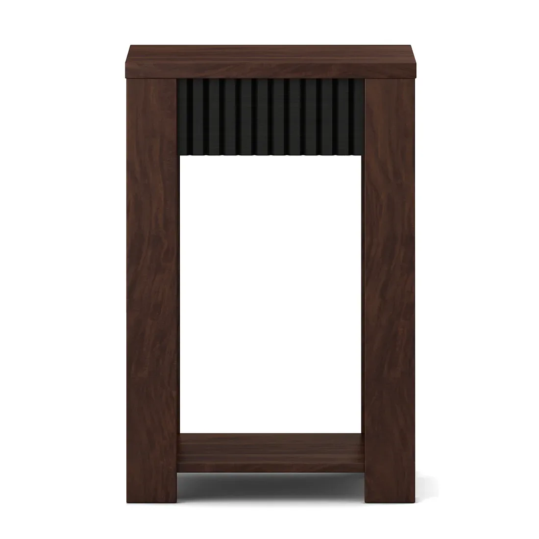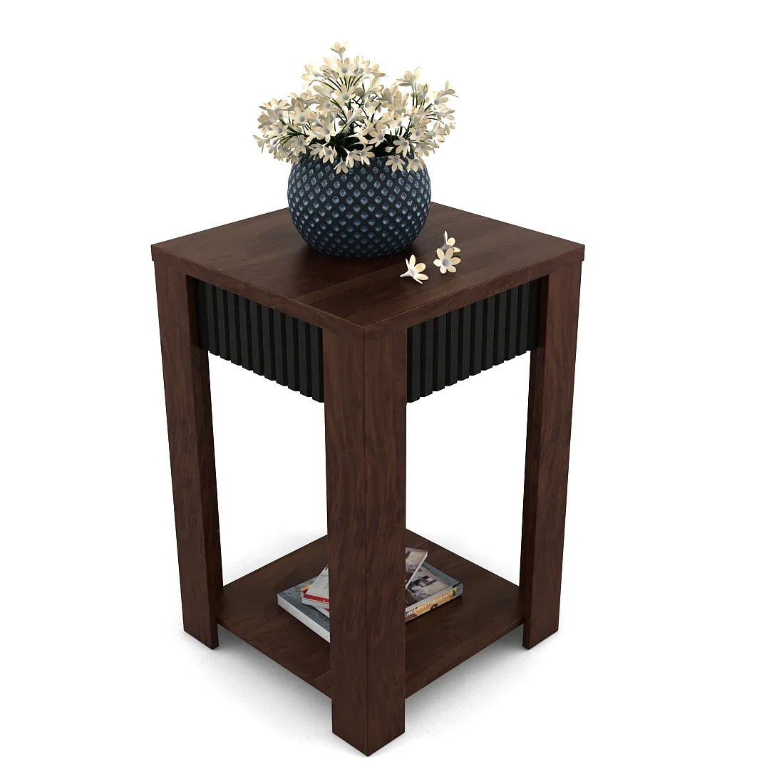 A modern engineered wood side table in rich sheesham finish, featuring fluted panels and an open shelf—durable, termite-proof, and stylish.