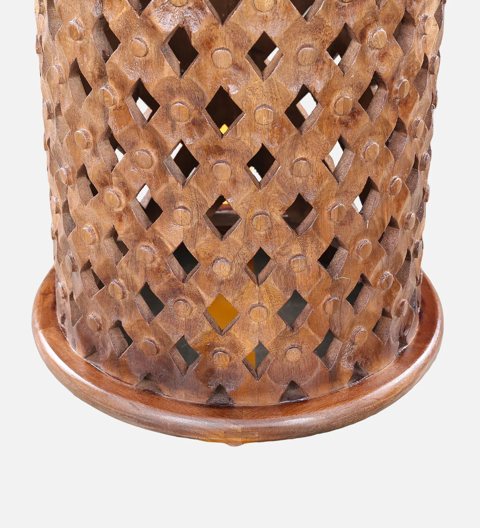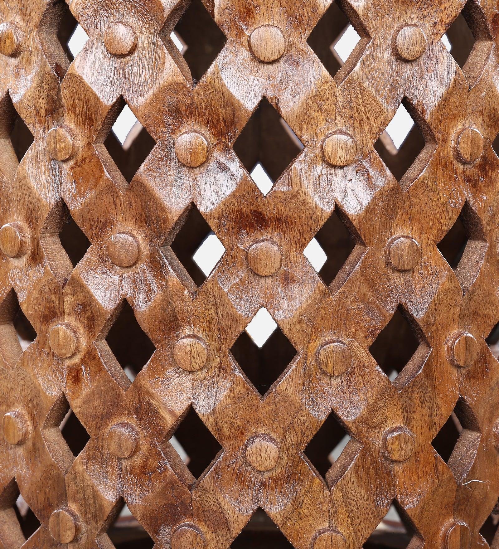 The cylindrical base features an intricate lattice-style carving, showcasing natural sheesham wood grain variations that make every piece truly one of a kind. Finished in a warm walnut tone, this versatile side table effortlessly complements modern, contemporary, and ethnic interiors.