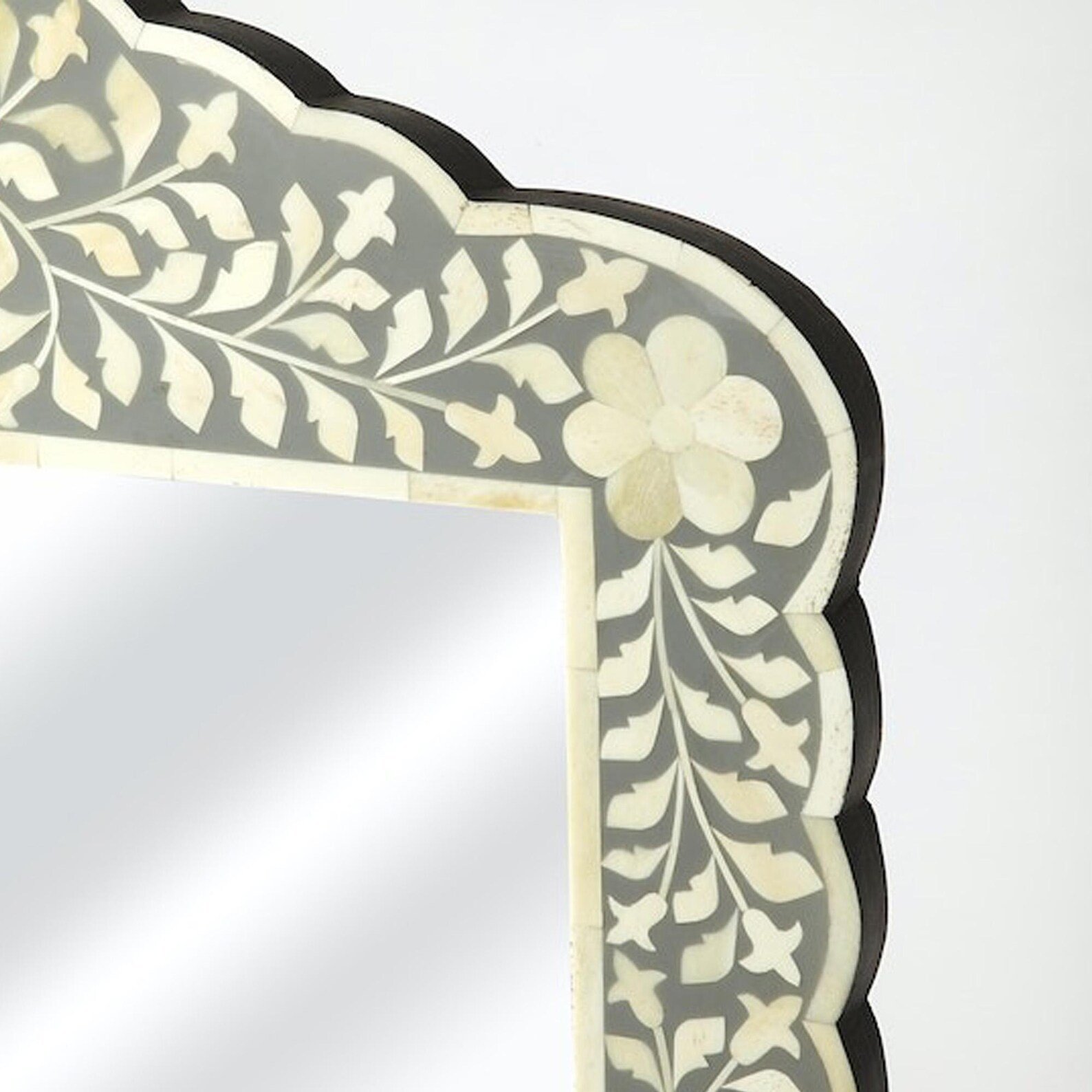The Vivienne Gray Bone Inlay Wall Mirror is a masterpiece of artisan craftsmanship and timeless luxury. Each piece features meticulously hand-cut bone and Mother of Pearl inlaid into a stunning floral motif set against a refined grey backdrop.