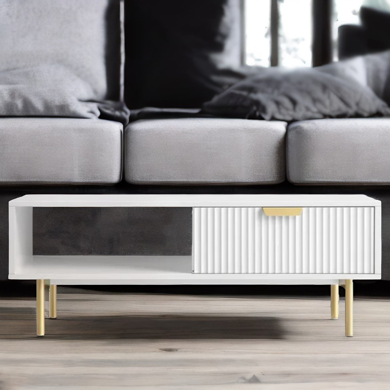 The smooth taupe finish enhances its minimalist charm, while the spacious drawer provides convenient storage for remotes, coasters, books, and other living room essentials. Its sturdy construction ensures long-lasting durability, making it a perfect centerpiece for modern, contemporary, or classic interiors.